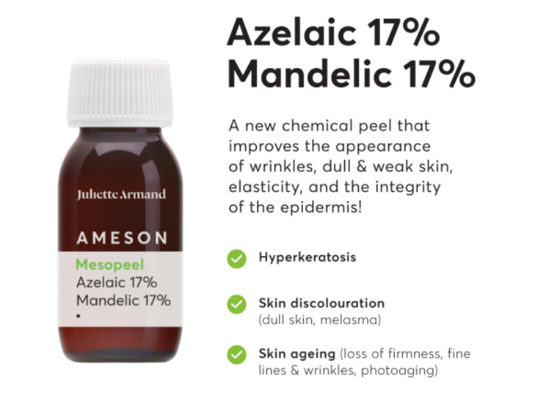 The Ameson Mesopeel range are advanced chemical peels designed to target specific skin concerns through a blend of potent, scientifically-backed ingredients. Each peel offers unique benefits, from gentle exfoliation, hydration, rejuvenating the deep renewal and acne treatment, allowing customised treatments that meet your skin’s unique needs. With a focus on safety and efficacy, these peels are applied in carefully controlled layers to maximise their effectiveness and minimise irritation. These are a superficial range of professional chemical peel systems based on organic acids, aimed at rejuvenating the skin and making it glowing, bright and soft. In particular, AHAs normalise and activate the skin’s rejuvenation process, increasing collagen and elastin production and in turn hydrating the skin. Meanwhile, beta hydroxy acid (BHA) has a potent exfoliating, anti-inflammatory and antimicrobial action – and azelaic acid’s action (AZA) is similar.