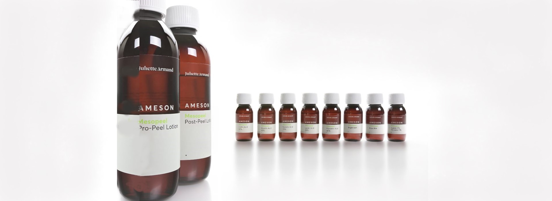 The Ameson Mesopeel range are advanced chemical peels designed to target specific skin concerns through a blend of potent, scientifically-backed ingredients. Each peel offers unique benefits, from gentle exfoliation, hydration, rejuvenating the deep renewal and acne treatment, allowing customised treatments that meet your skin’s unique needs. With a focus on safety and efficacy, these peels are applied in carefully controlled layers to maximise their effectiveness and minimise irritation. These are a superficial range of professional chemical peel systems based on organic acids, aimed at rejuvenating the skin and making it glowing, bright and soft. In particular, AHAs normalise and activate the skin’s rejuvenation process, increasing collagen and elastin production and in turn hydrating the skin. Meanwhile, beta hydroxy acid (BHA) has a potent exfoliating, anti-inflammatory and antimicrobial action – and azelaic acid’s action (AZA) is similar.